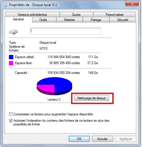 Allez dans « ordinateur », faites un clique droit sur la partition Windows « C : », puis « propriétés »