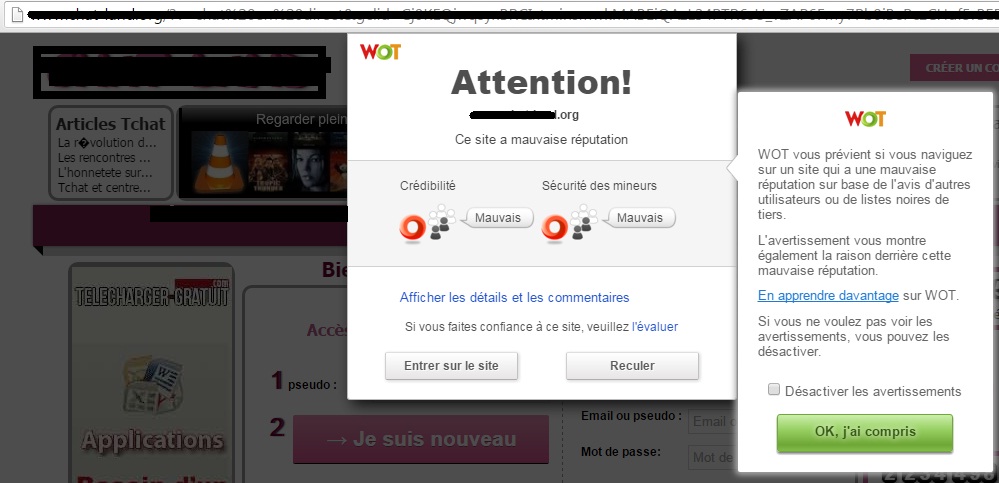 Si vous êtes déjà sur le site, vous pouvez aussi le vérifier avec WOT. Vous cliquez sur l’icône en haut, à droit et une petite fenêtre s’ouvre qui semble à quelque chose comme ça :