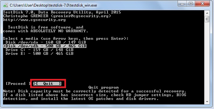 Une fois que TestDisk détecte vos disques durs, sélectionnez le disque en question puis « Proceed ».
